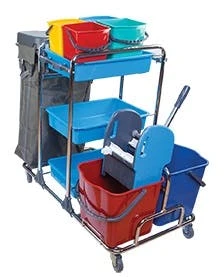 CleanSV® verchromter Putzwagen mit Profi Mopresse, 2 Gitterkörben, 1 Ablage und 2 Plastikeimer